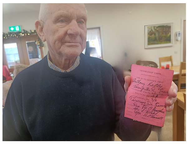 Tony is pictured here with his club membership card from 1960, the photo was taken by Mary O’Donnell earlier this year when the Liam McCarthy cup visited Cuan an Chláir.