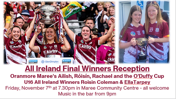 We are excited to invite all our members, both young and old, to join us this Friday, November 7th, at 7:30 PM at the Maree Community Centre to celebrate our 2025 All Ireland Camogie winners. In 2025, Ailish O’Reilly, Roisin Black, and Rachael Hanniffy proudly stood on the steps of the Hogan as Galway lifted the O’Duffy Cup. Additionally, Roisin Coleman and Ella Tarpey were part of the All Ireland winning U16 Galway team.