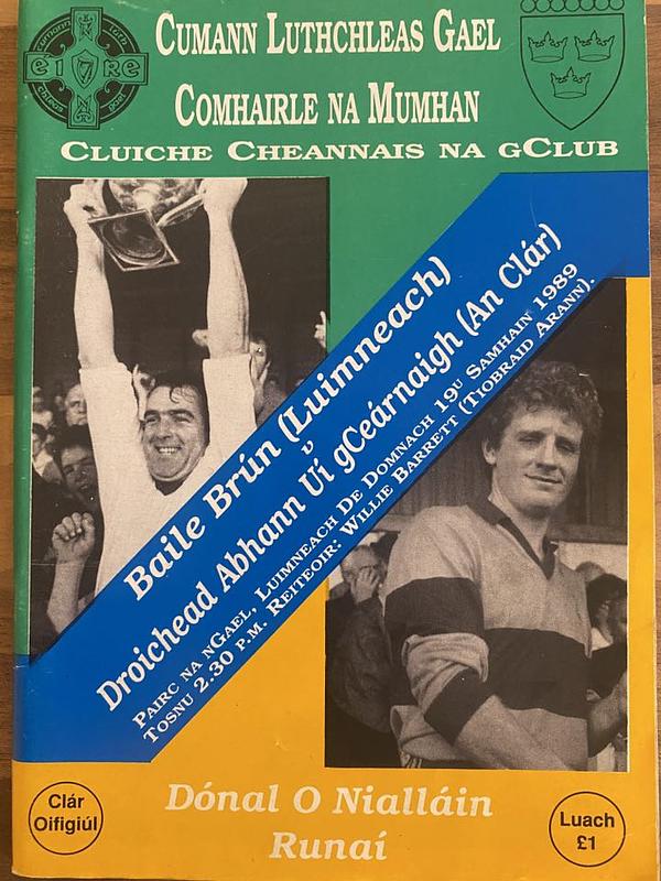 Some lovely memories from the 1989 Munster Club Hurling final programme whcih was recently featured on Seamus McQuaids Gaa Programme Collectors Facebook page. The game featured Sixmilebridge and Ballybrown. The result infortunately did not go our way on the day but a great team many of whom went on to glory on All Ireland Club Final day in Crole Park in 1996.