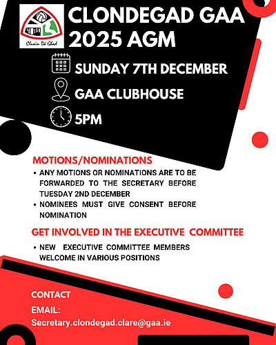 The Clondegad GAA 2025 AGM will take place on Sunday 7th December at 5pm in the Clubhouse