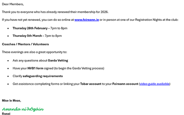 If you have not yet renewed, you can do so online at www.foireann.ie or in person at one of our Registration Nights at the club: