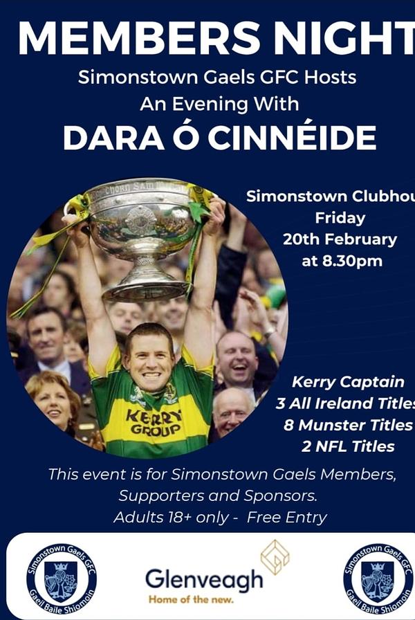 We are delighted that Dara ÓCinnéide is in our club this Friday night (20th), for an engaging and interesting interview with Colm Keys.  This will start at 830pm sharp and we hope as many of our members, supporters and sponsors as possible can attend.  Our club bar has undergone a recent facelift with new flooring and painting and its first event will be the talk with Dara.  Many thanks to John Lynch of John Lynch Carpets and to Dominic Smith Electrical Navan for the invaluable support in this project. We will also hold our third 200 Club Draw that night and there are still tickets available.  Someone will be winning €1000 on Friday next and if you enter, on your own, as part of syndicate it could be you.  Purchase via Clubzap or on the night.