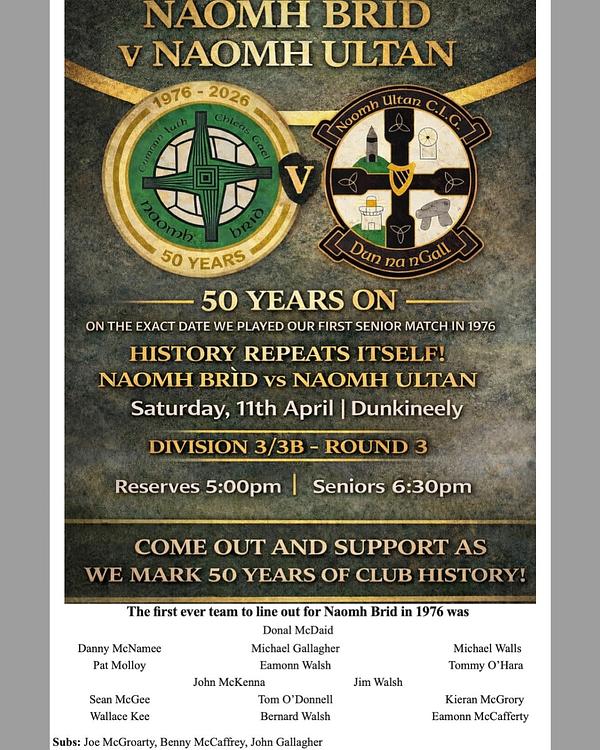 History repeats itself this Saturday as Naomh Bríd take on Naomh Ultan — exactly 50 years on from our very first senior match in 1976 against the very same opposition, on the exact same date.