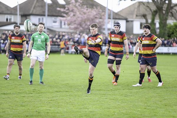But ten minutes in, we all settled down and the quality started. Our attack was patient and deliberate with Stephen Madigan stewarding the play left and right, then unexpectedly, he chips over their centres but in spite of the groans of Lansdowne supporters Harry O’Riordain charges through and gathers the ball, carrying well into their 22 and setting us up for our first serious attack. We get a kickable penalty and opt for the corner, a positive move, but for the first of many set pieces, Clontarf frustrate our efforts and steal it, exiting their danger zone. Our attack resumes, but there’s a caution there and soon ‘Tarf turn over and counter back into our half. Their first serious visit and they plant a flag with a score in the corner. A defensive glitch in the centre and they slice through the gap and their lock Fionn Gilbert touches down. After his miss under the posts, we have high hopes that Kelly will miss this near impossible conversion into the wind from the touchline. No such luck. 7 – 0