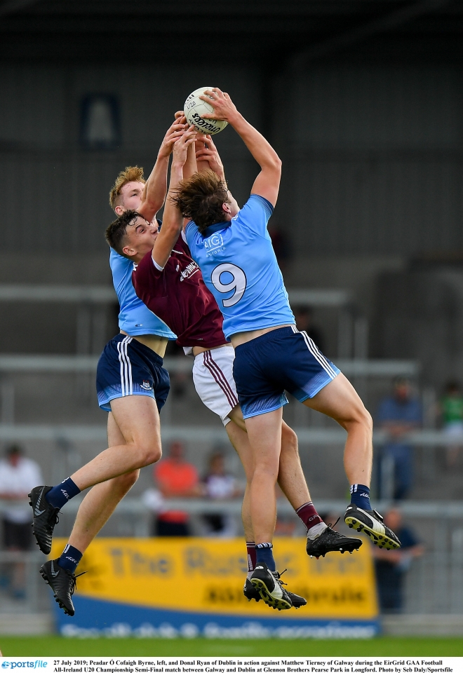 Dublin senior panellist of this year, Peadar Ó Cofaigh Byrne (pictured below in action against Galway with Na Fianna's Donal Ryan), who also starred for the county's U20 footballers, dominated at midfield with Eoin Kennedy and Eoghan O'Callaghan also impressing for Cuala.